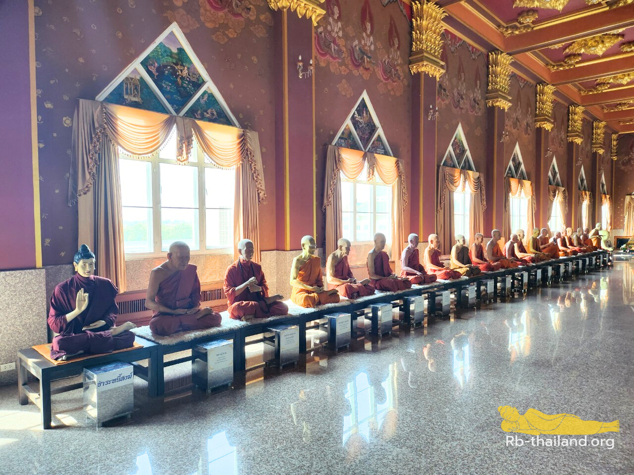 บนฝาผนังมีภาพวาดองค์พระนอนและพุทธศาสนิกชนมากมาย ภาพถูกวาดอย่างประณีต เป็นงานที่ละเอียดมาก และยังมีรูปหุ่นขี้ผึ้งของเกจิอาจารย์ดังนับ 10 องค์ประดิษฐานอยู่ ส่วนที่บริเวณชั้น 3 จัดทำขึ้นสำหรับเป็นที่พักของพระผู้ใหญ่โดยเฉพาะและไม่ได้เปิดให้ขึ้นชม ด้านหลังพระอุโบสถมีรูปหล่อสีดำนิล สมเด็จพระพุฒาจารย์ (โต พรหมรังสี)