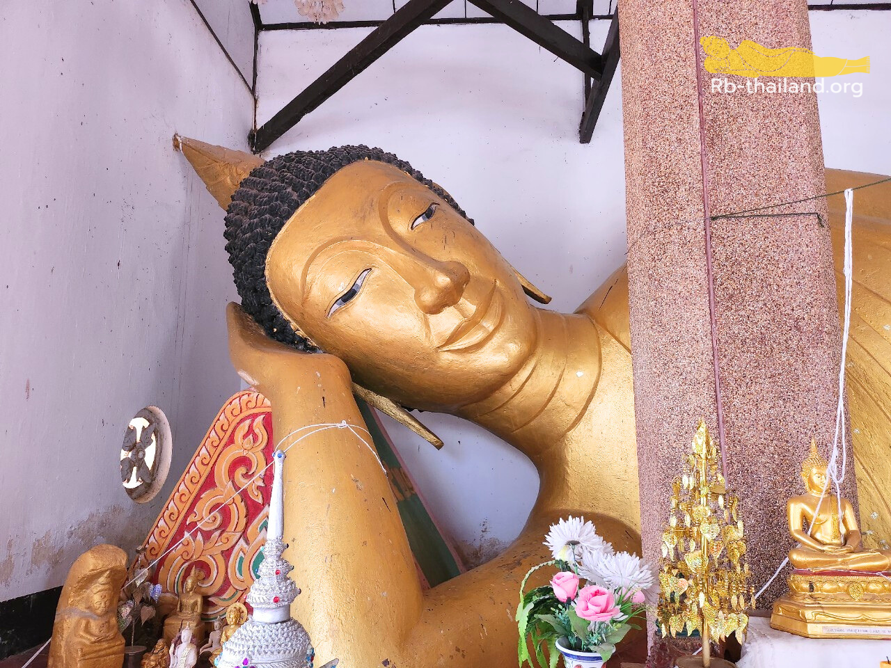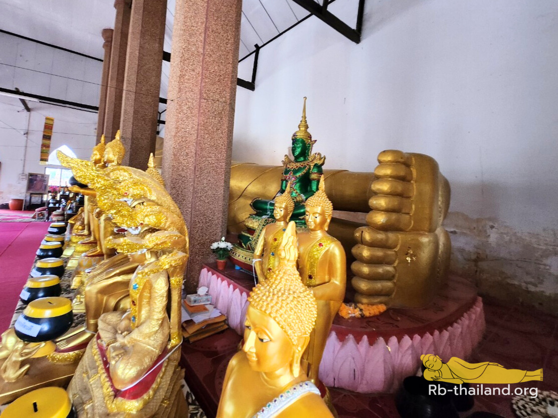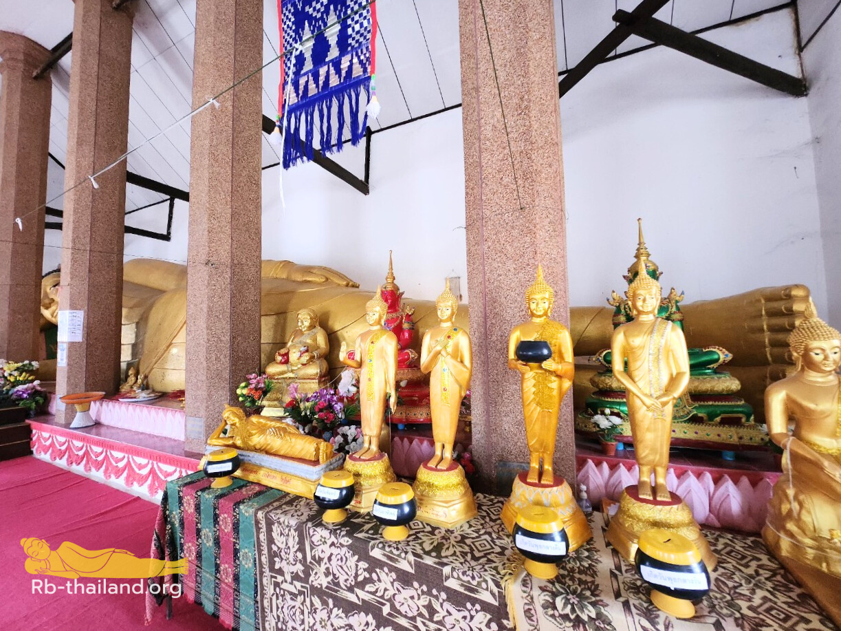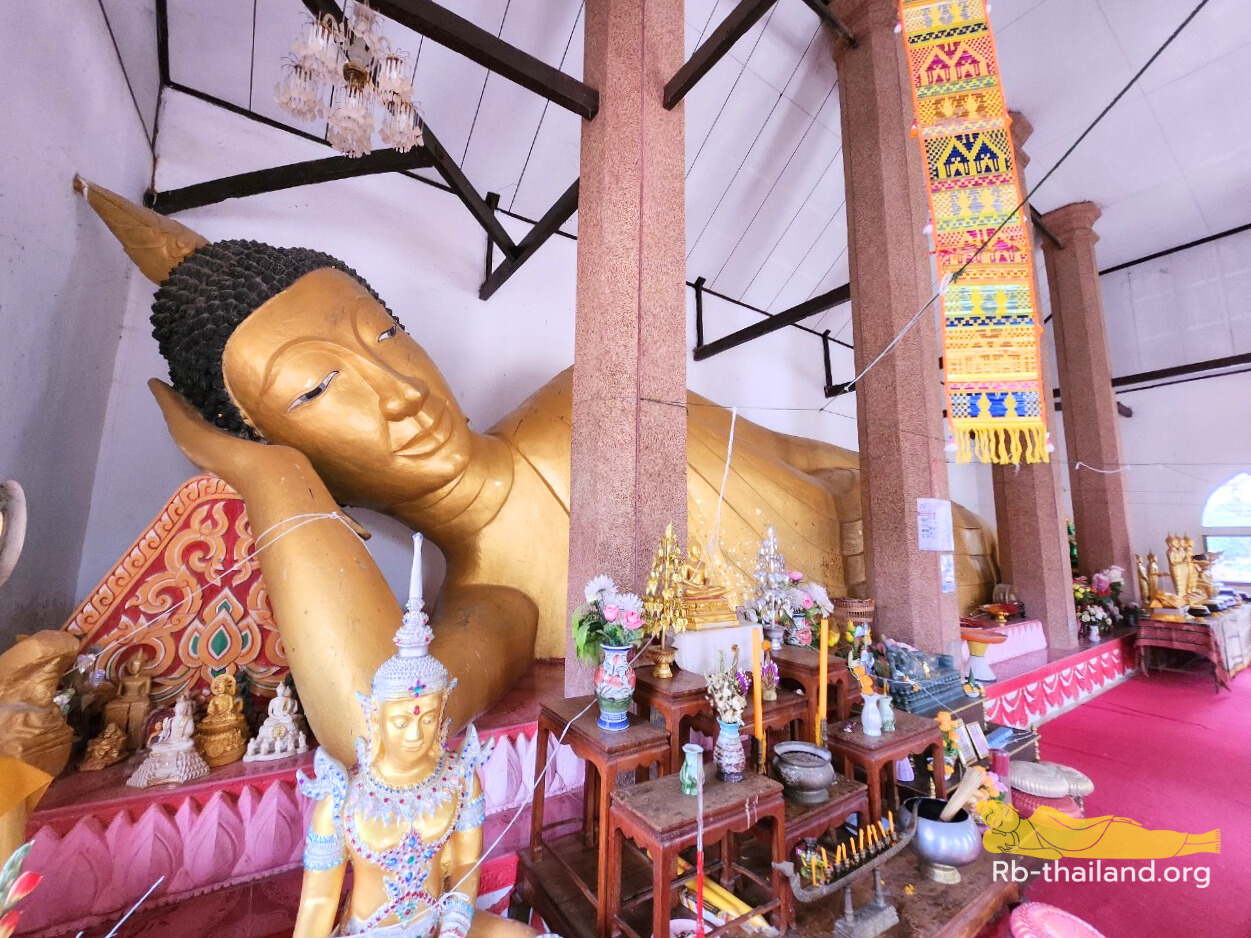 ภายในวิหารพระุทธไสยาสน์ ประดิษฐาน พระนอนหรือพระพุทธไสยาสน์ สร้างขึ้นปี พ.ศ. 2521 ช่างปั้นพระนอน คือ นายแสง ขณะปั้นรูปพระนอนแล้วเสร็จมาจนถึงพระศอแล้ว พอถึงเวลาจะปั้นเศียร ก็เกิดปัญหาปูนก่อไม่จับกัน จนช่างหมดวิธี เพราะก่อยังไงก็พังลง จึงได้นิมนต์ หลวงพ่อหลาวทอง โอสโก หลวงพ่อได้อธิฐานและนำพระทองสัมฤทธิ์สูง 9 นิ้ว หน้าตักกว้าง 9 นิ้ว ทำพิธีอัญเชิญเทพเทวา จากนั้นช่างก็ก่อสำเร็จ แล้วเสร็จในปี พ.ศ. 2523 และทำพิธีพุทธาภิเษกมหามงคล